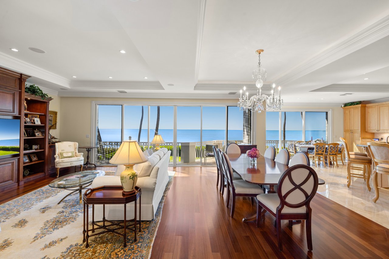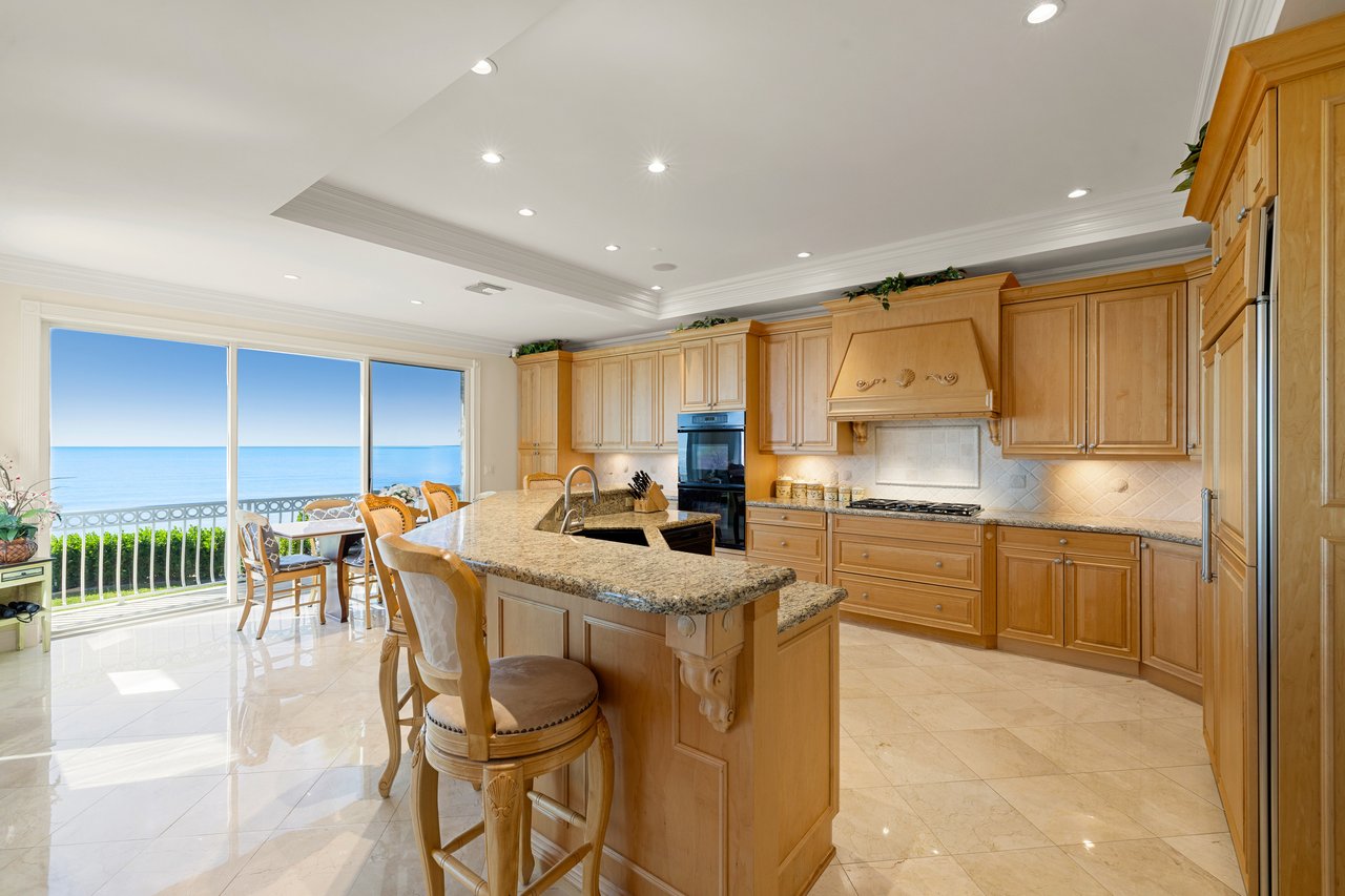 The primary living level stretches gracefully along the shoreline, capturing mesmerizing, unobstructed views of the Gulf and its crystalline coastline. Designed for relaxed coastal living and effortless entertaining, the open kitchen flows seamlessly into the great room, where expansive pocketing glass doors dissolve the boundary between indoors and out, opening to a generous covered balcony overlooking the beach.