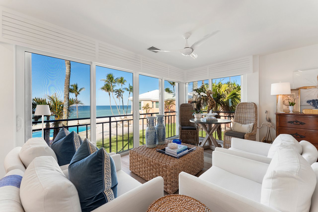 | Perched on the second floor in the Shores of Naples, Villa #2 offers a beach home perspective with the convenience of condo living. Step in through the front door and be greeted by the crisp waters of the gulf which is the perfect backdrop for the recently BCB remodeled interior. European White Oak flooring, classic ship lap wall detailing, luxurious Carrara countertops, impact windows and a well-designed kitchen are just a few features to mention. The oversized primary suite offers a walk in closet and spacious bath with dual sinks while guests will feel right at home in their private ensuite bedroom. The great room offers a flexible space for dining, relaxing or entertaining and has sliding glass doors to open and listen to the sounds of the surf in the background or feel the refreshing coastal breeze. Steps from the beach and centrally located in the Moorings, Shores of Naples Villas #2 is one you must see. | ||||||